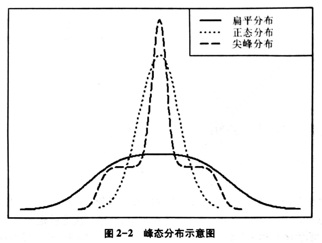 峰态通常是与标准正态分布相比较而言的。如果数据服从标准正态,则峰度系数等于零;若峰度系数的值明显不为零,则表明数据的分布比正态分布更平或更尖,如图所示。