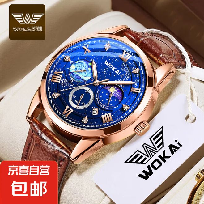 沃凯全自动机芯械男士手表高档日历石英表男款潮流时尚手表男名表 时尚款蓝面